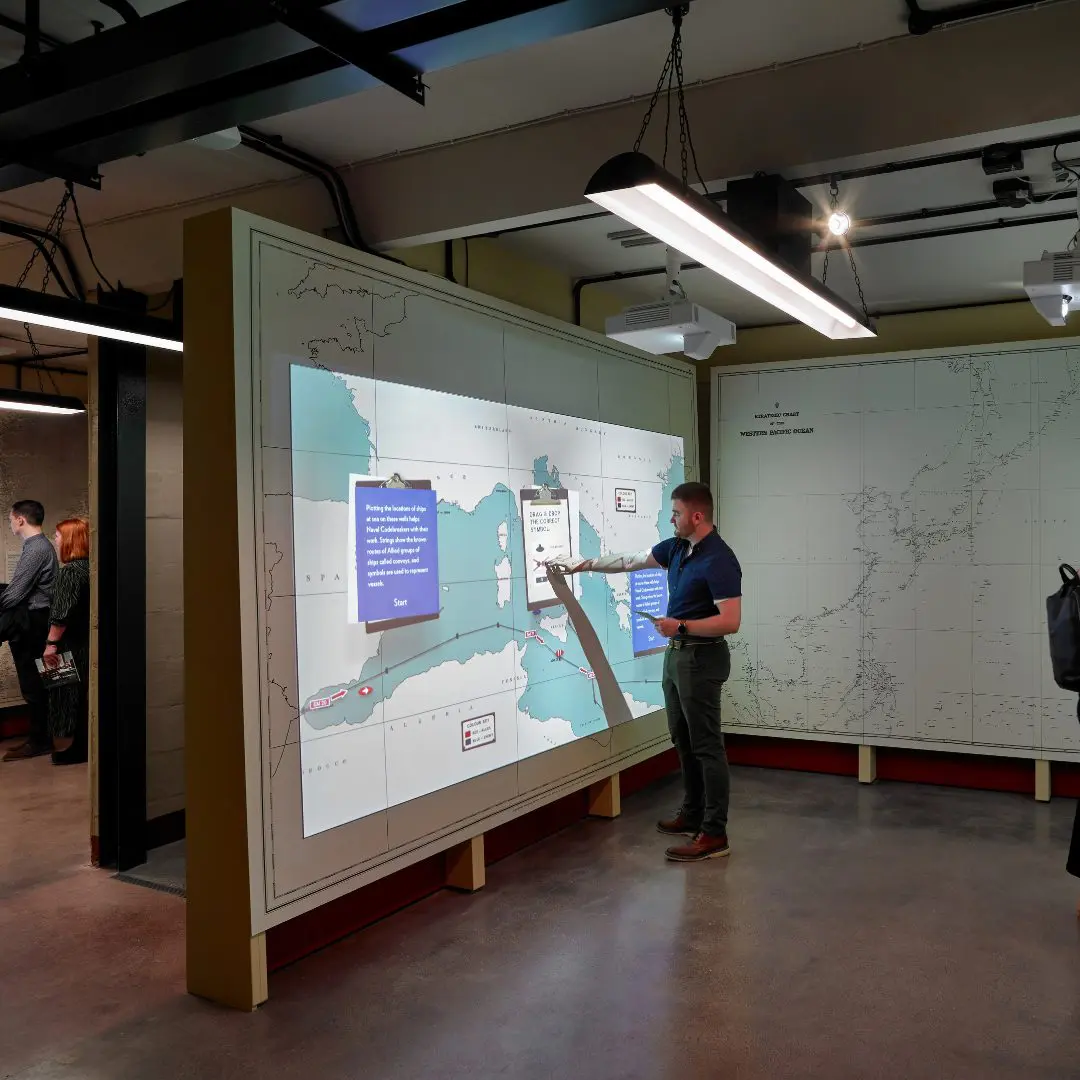 Textual layers, moving projections and tactile panels combined to create an immersive effect. We recreated key operations, like the naval plotting room, which was assembled with large MDF panels resembling maps. A complex array of strings and map pins overlaid each panel to allow visitors to plot the war’s course.